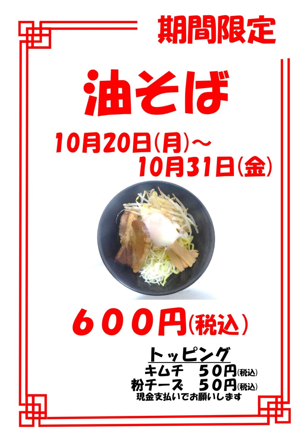 油そばを600円で販売いたします。