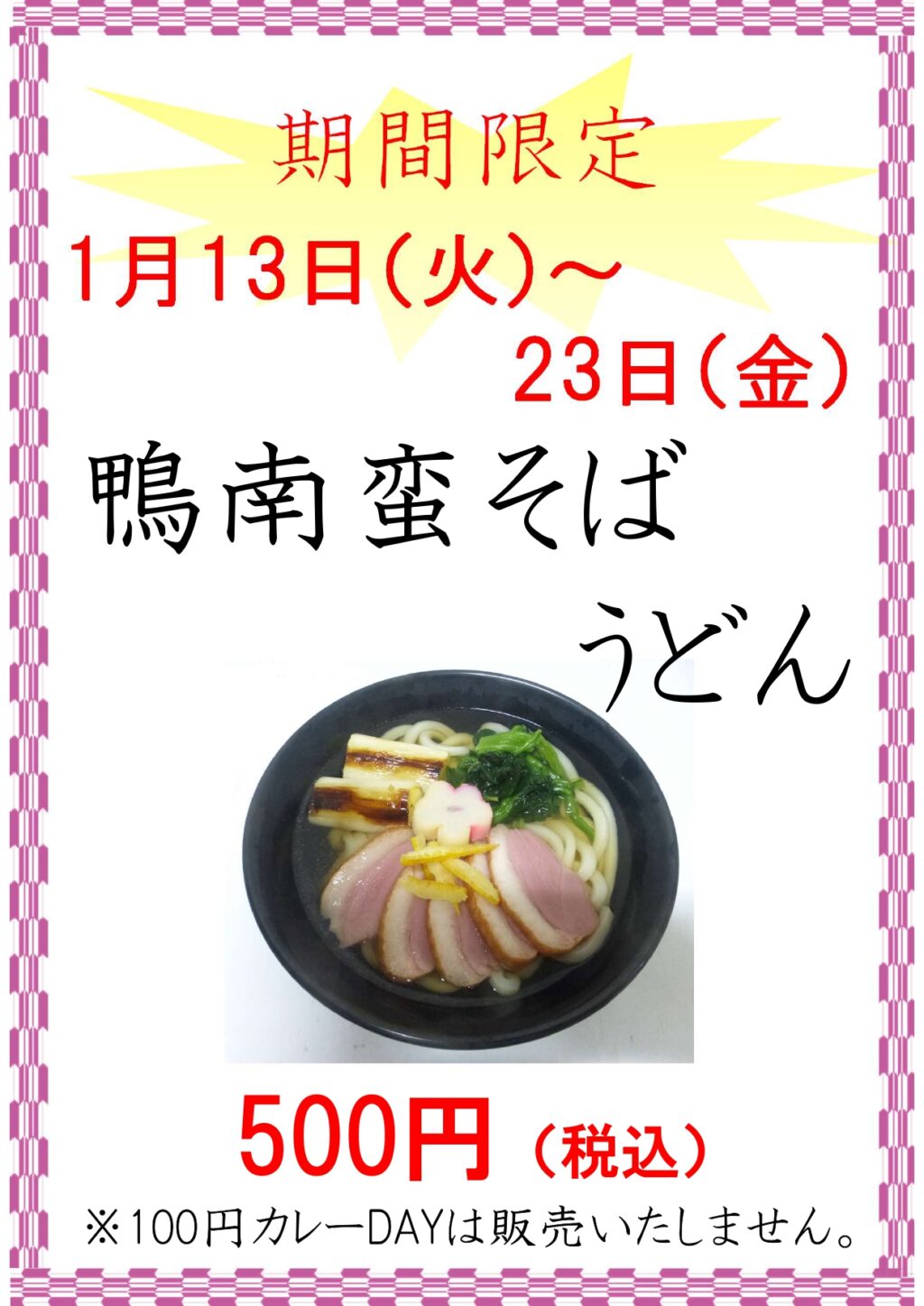 1/13(火)~1/23(金)の期間、八木山食堂にて鴨南蛮そば・うどんを500円で販売いたします。