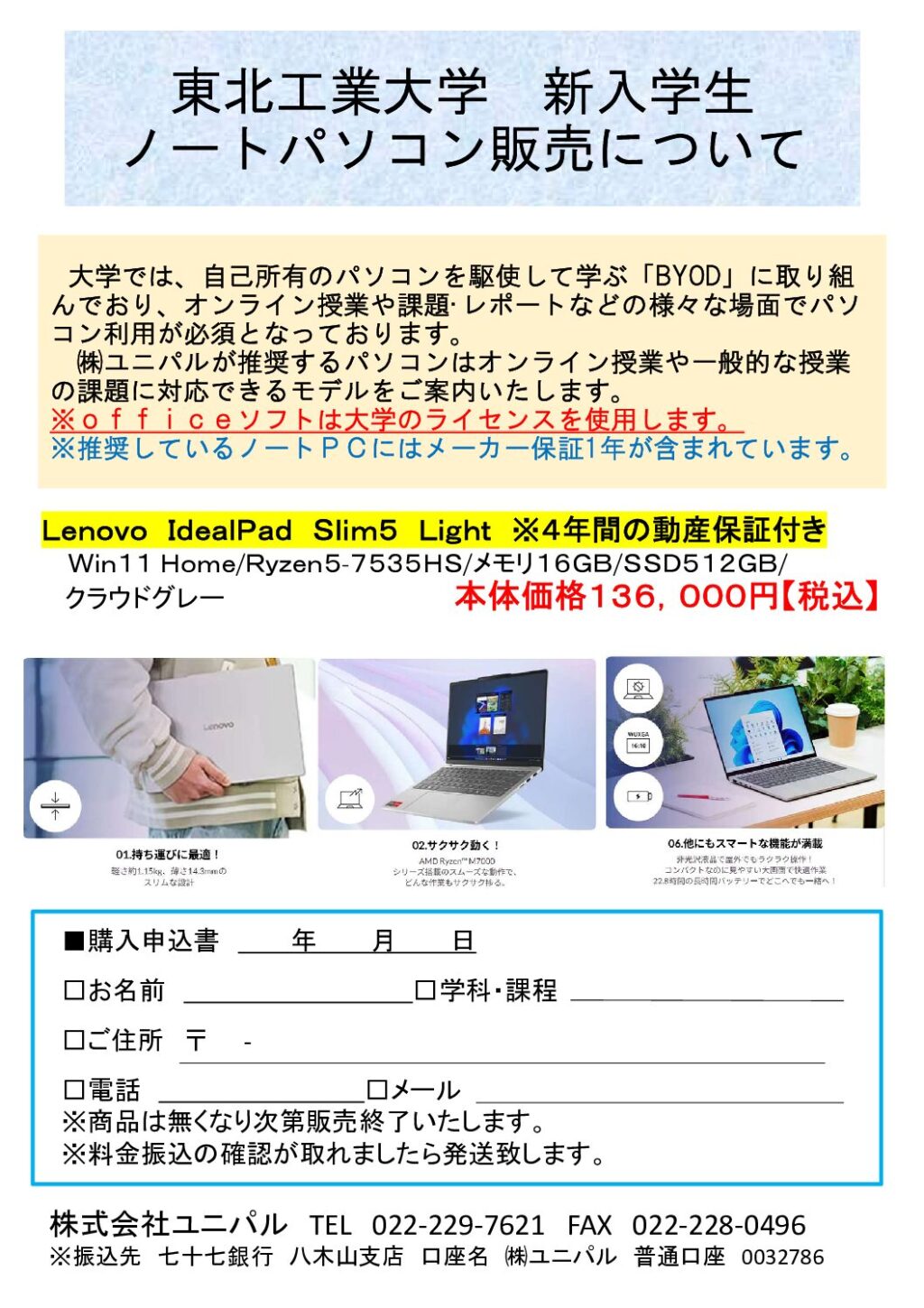 ノートパソコン販売について 2025/11/21 お知らせ ユニパルでは新入学生を対象としたノートパソコンの販売を行います。こちらの商品は4年間の動産保証が付き、お買い得商品となっています。購入ご希望の方は、FAXまたはホームページ上のお問合せバナーよりご注文ください。 Lenovo資料ダウンロード Lenovo保証資料ダウンロード