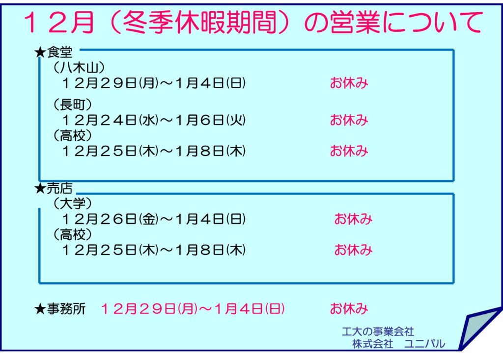 年末年始の営業について 2025/12/19 お知らせ 年末年始の各グループの営業について、休み期間は別表となりますのでご確認ください。※八木山1号館ラウンジ・長町4号館1階・高校アリーナ内に設置している、パン自動販売機は稼働していますのでぜひご利用ください。